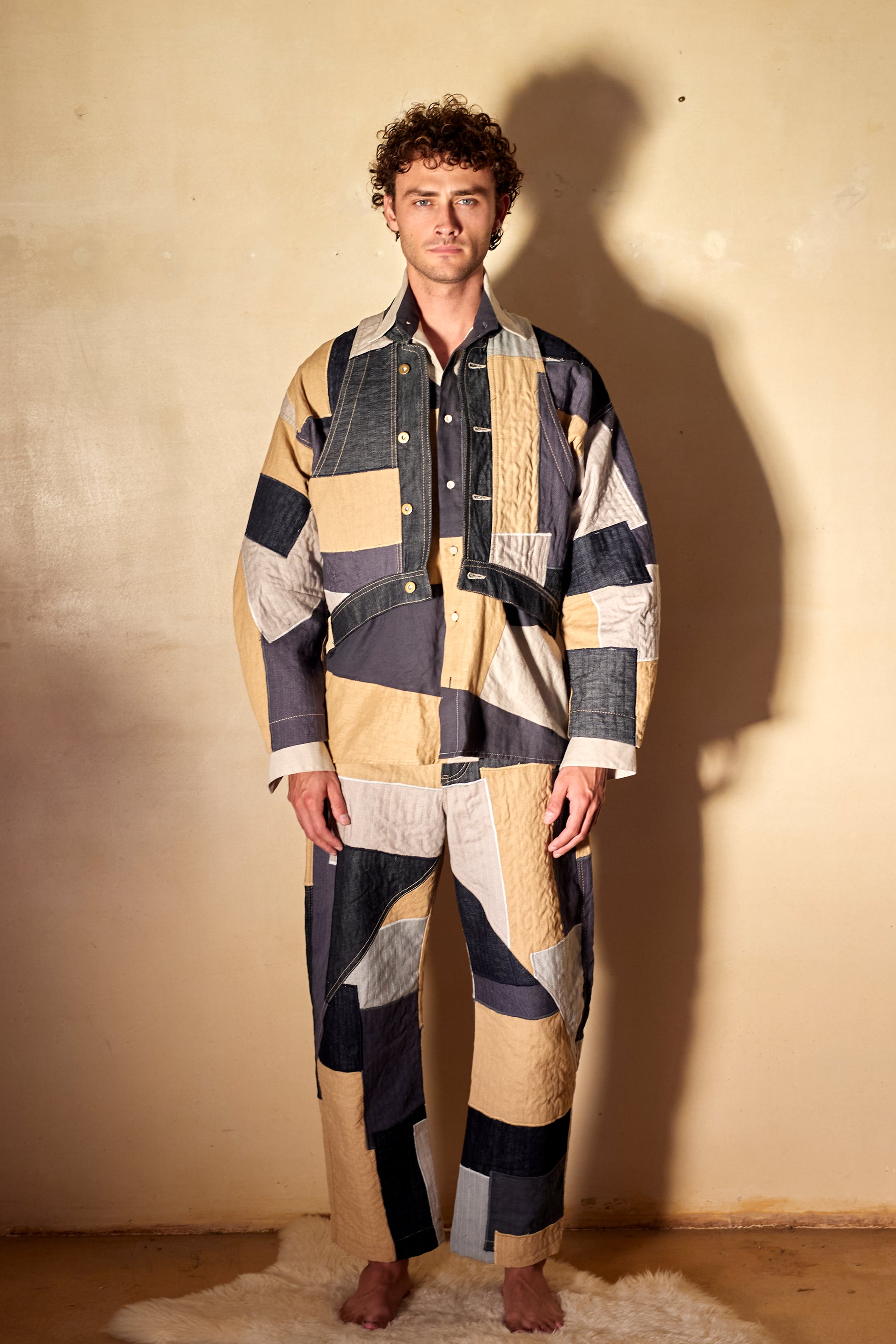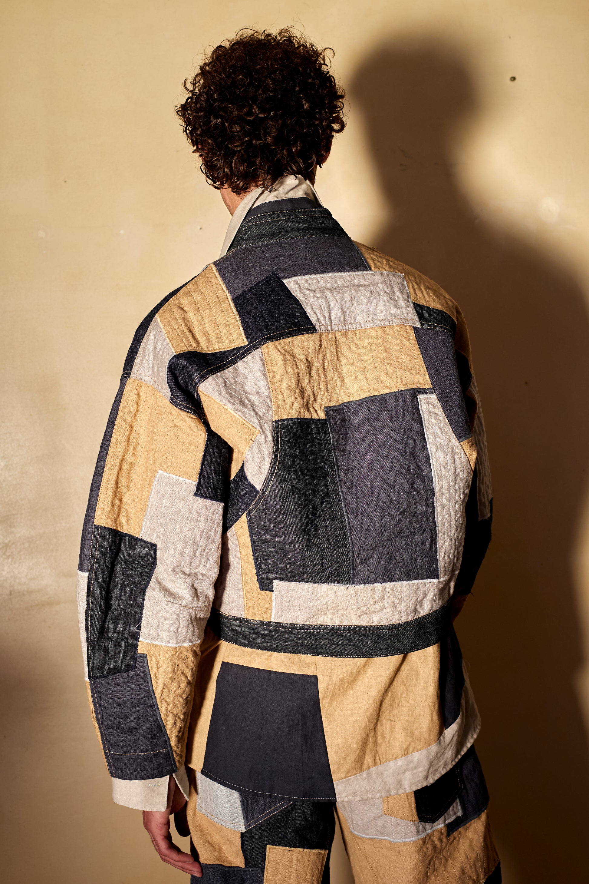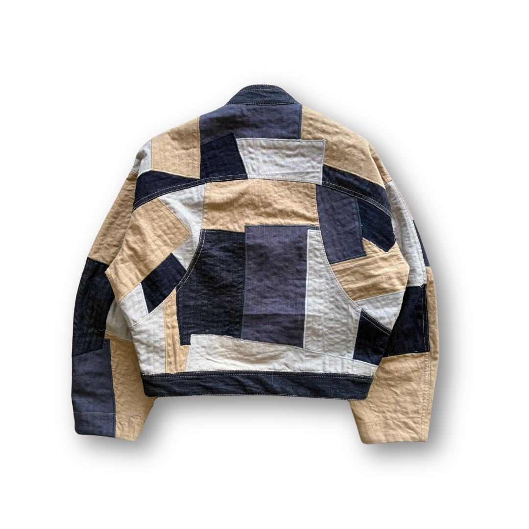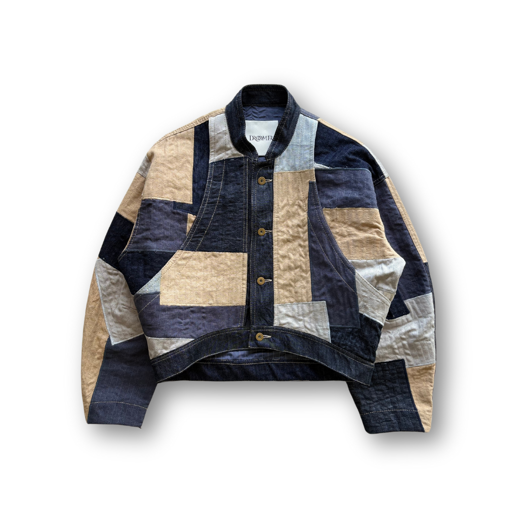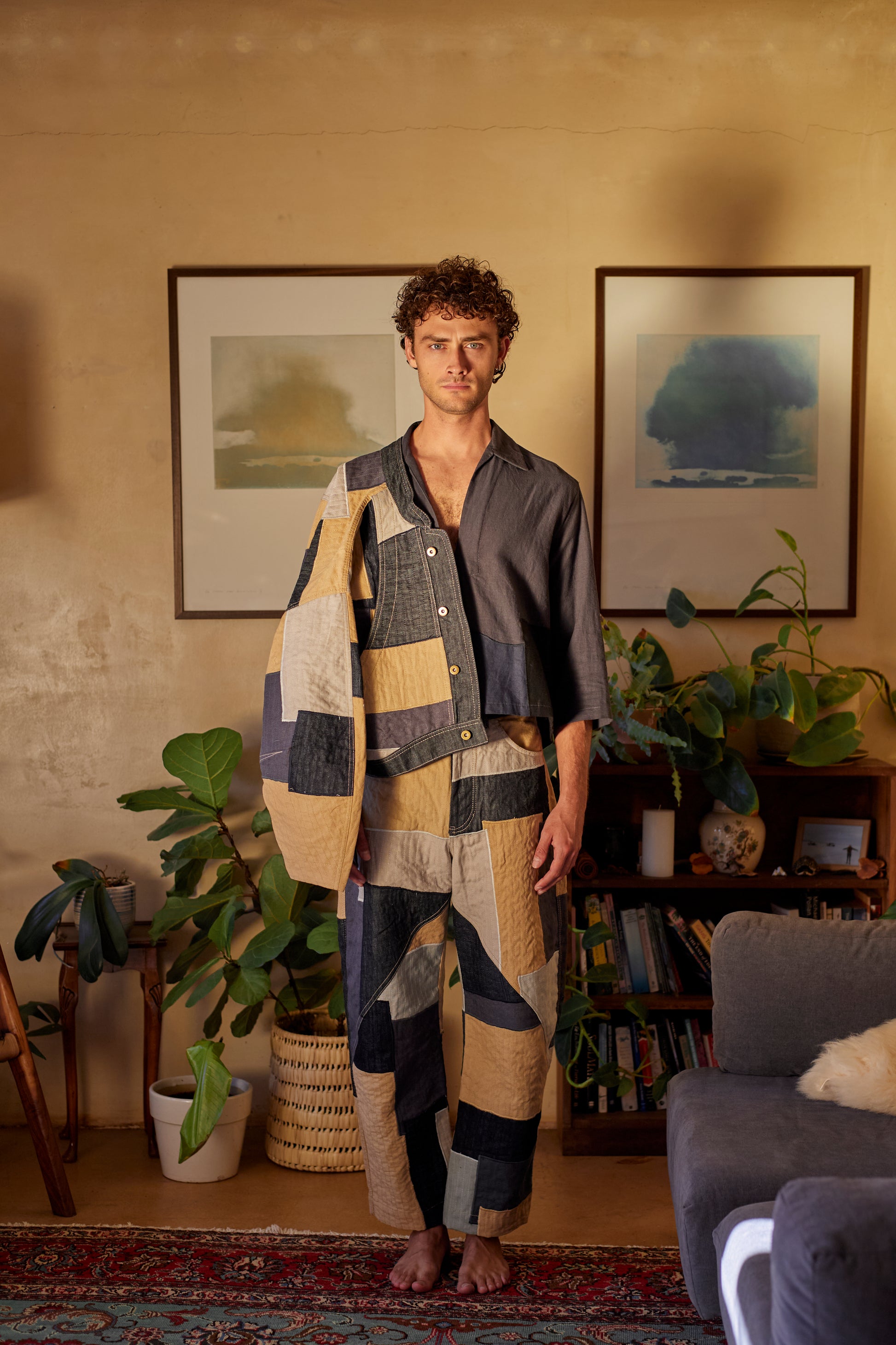A garment as storied as it is sculptural—The Azar Jacket is a bold, cropped statement layer, meticulously pieced from hemp canvas and denim offcuts.