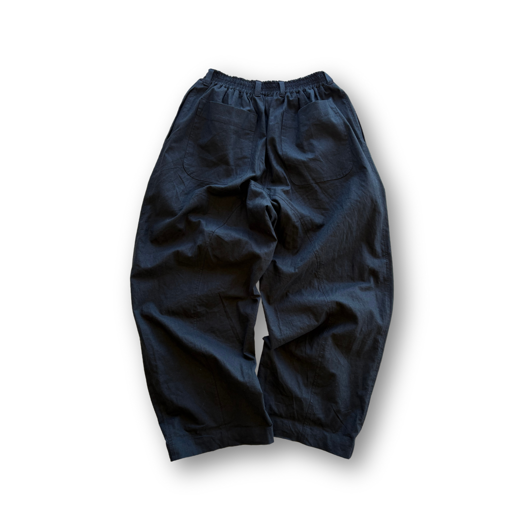 Generous pleats gather softly into an elasticated waistband, while the signature arc-shaped leg lends a sculptural, cocoon-like volume. Back patch pockets add utility without disrupting the clean lines.
