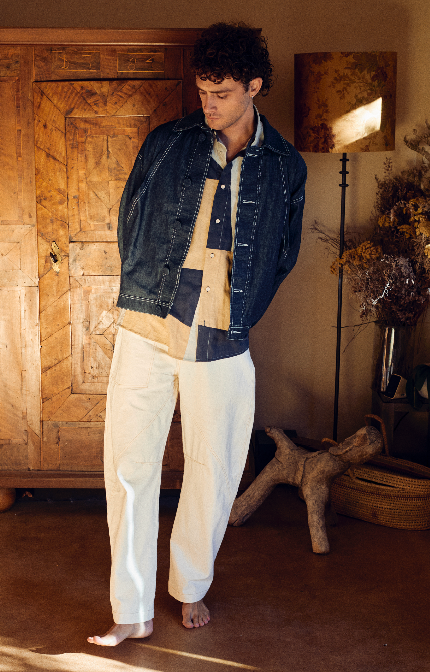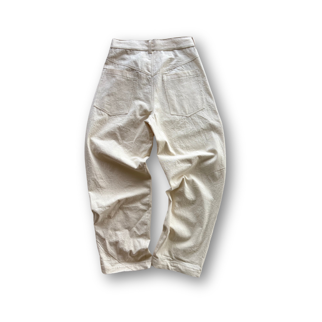 Crafted from crisp 100% cotton, the barrel-leg silhouette is shaped with subtle curved panelling that creates a gentle cocooned volume. Asymmetrical pocket placements add a touch of the unexpected, while the mid-rise fit and button fly closure lend a tailored, utilitarian edge.