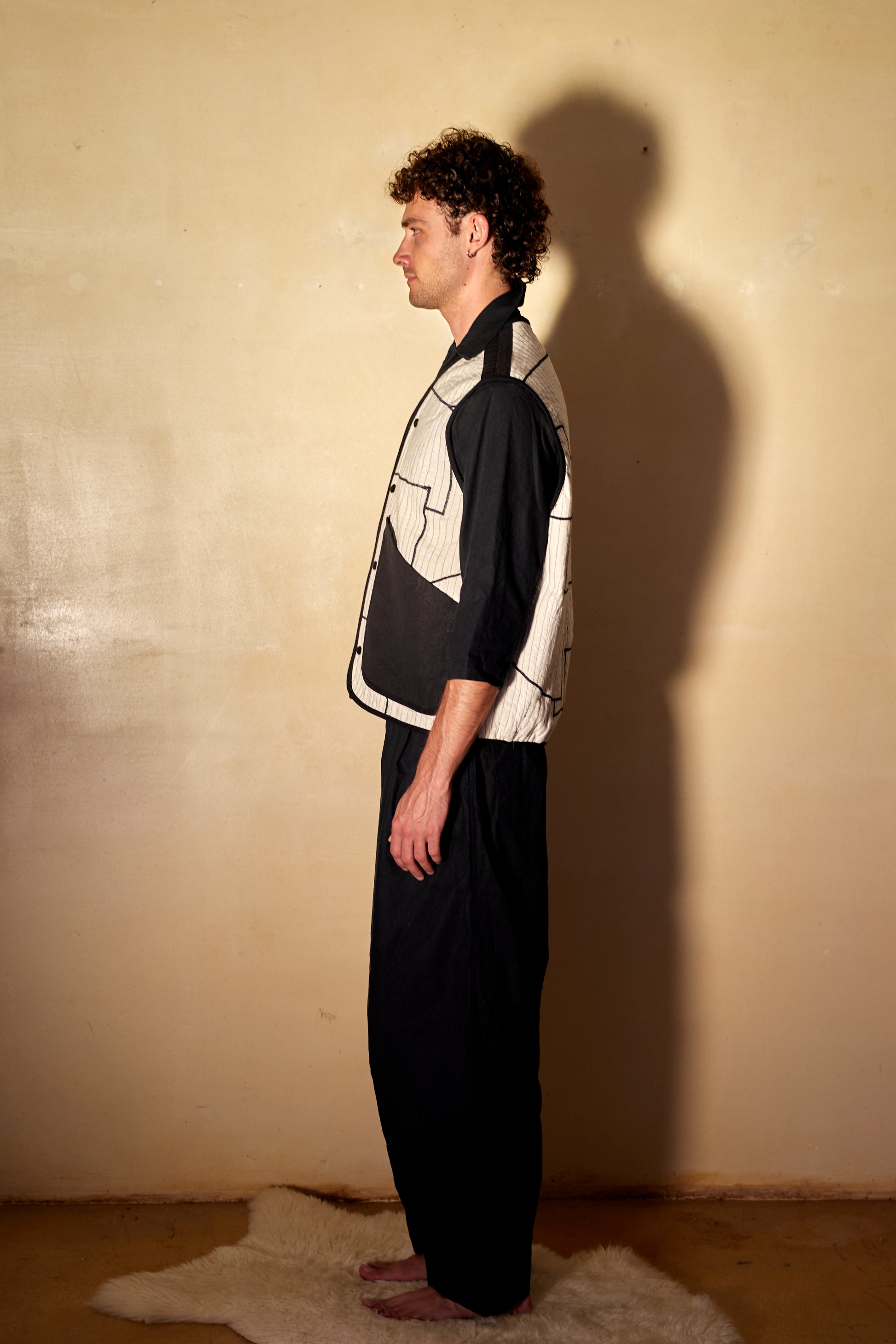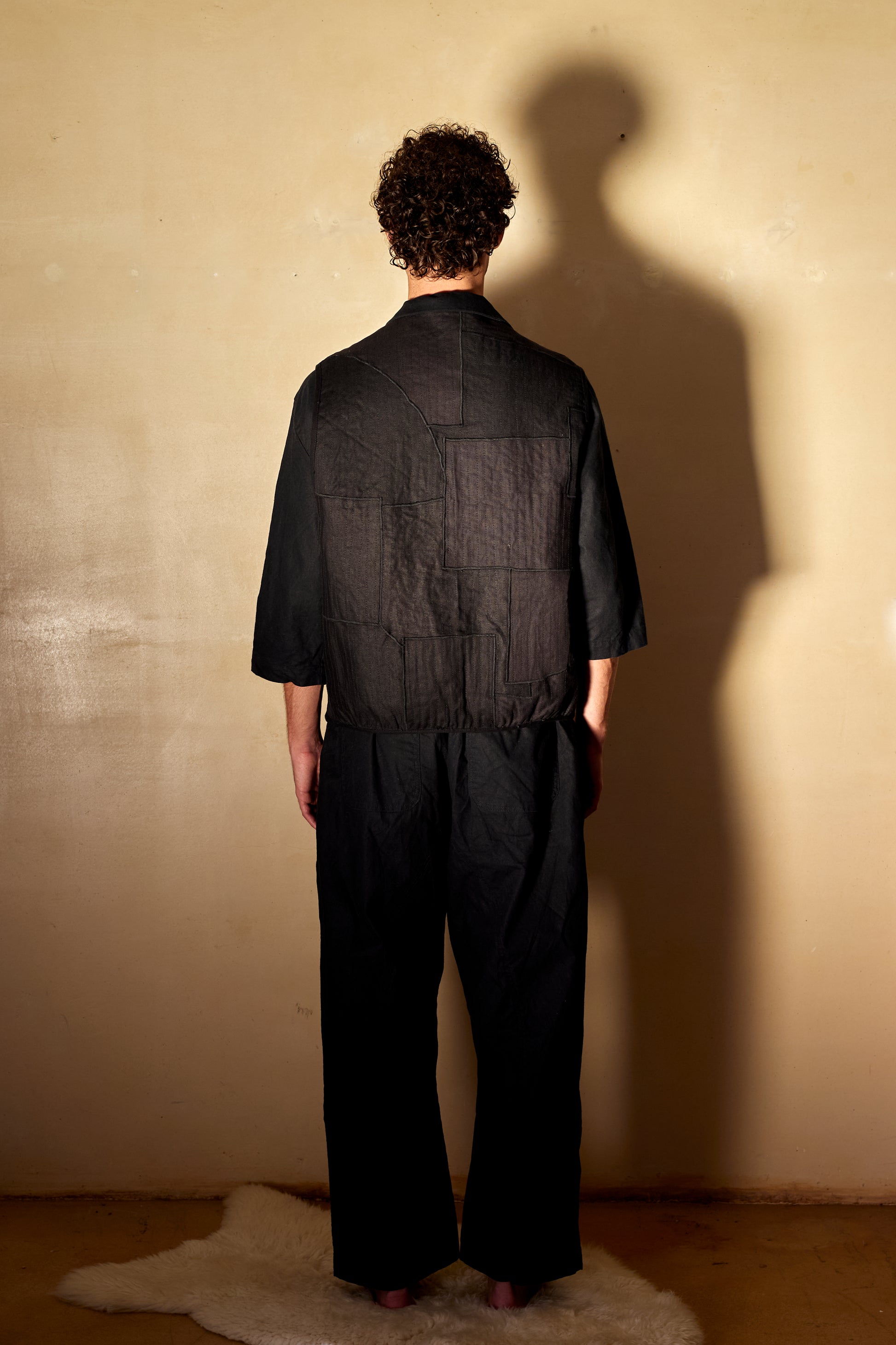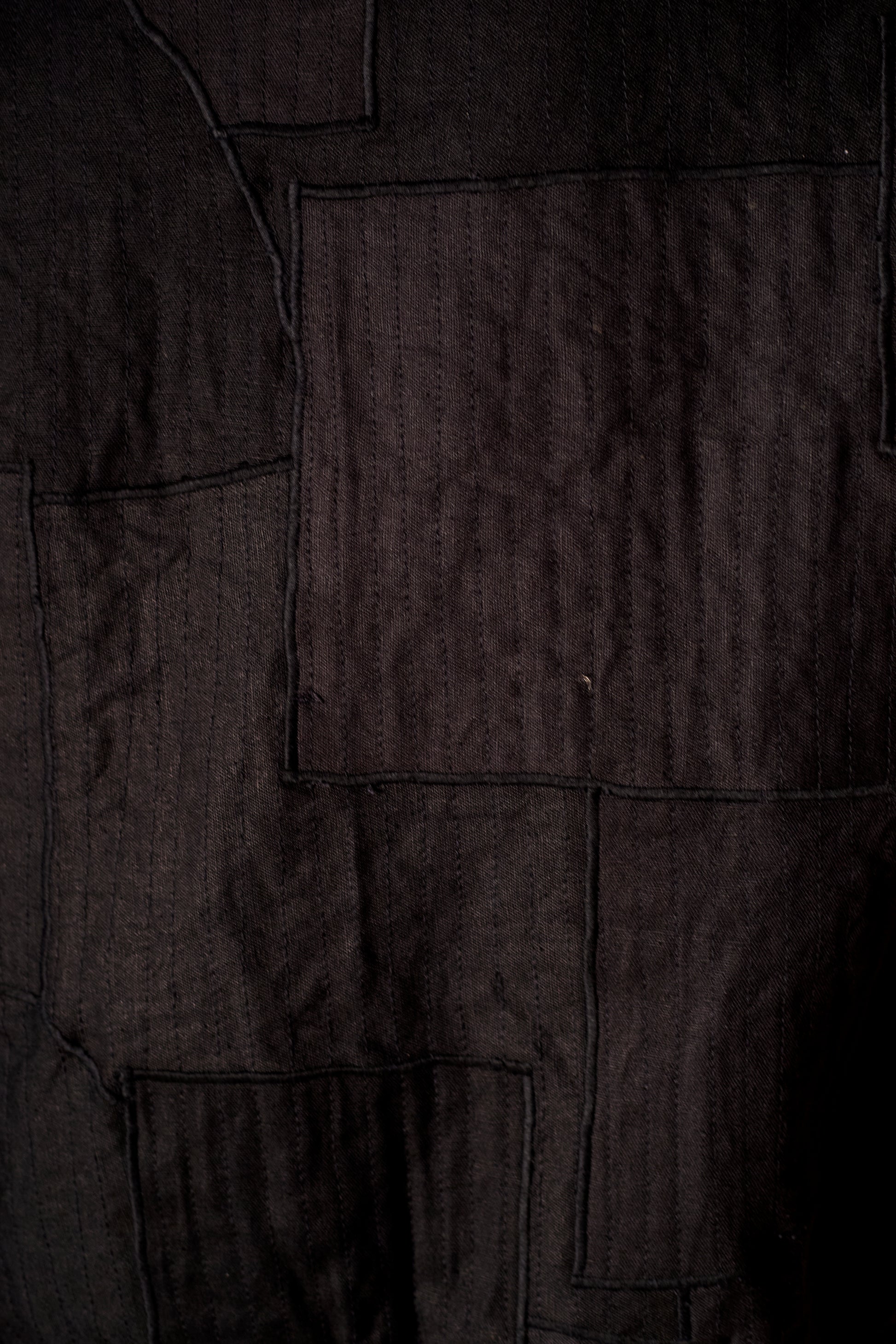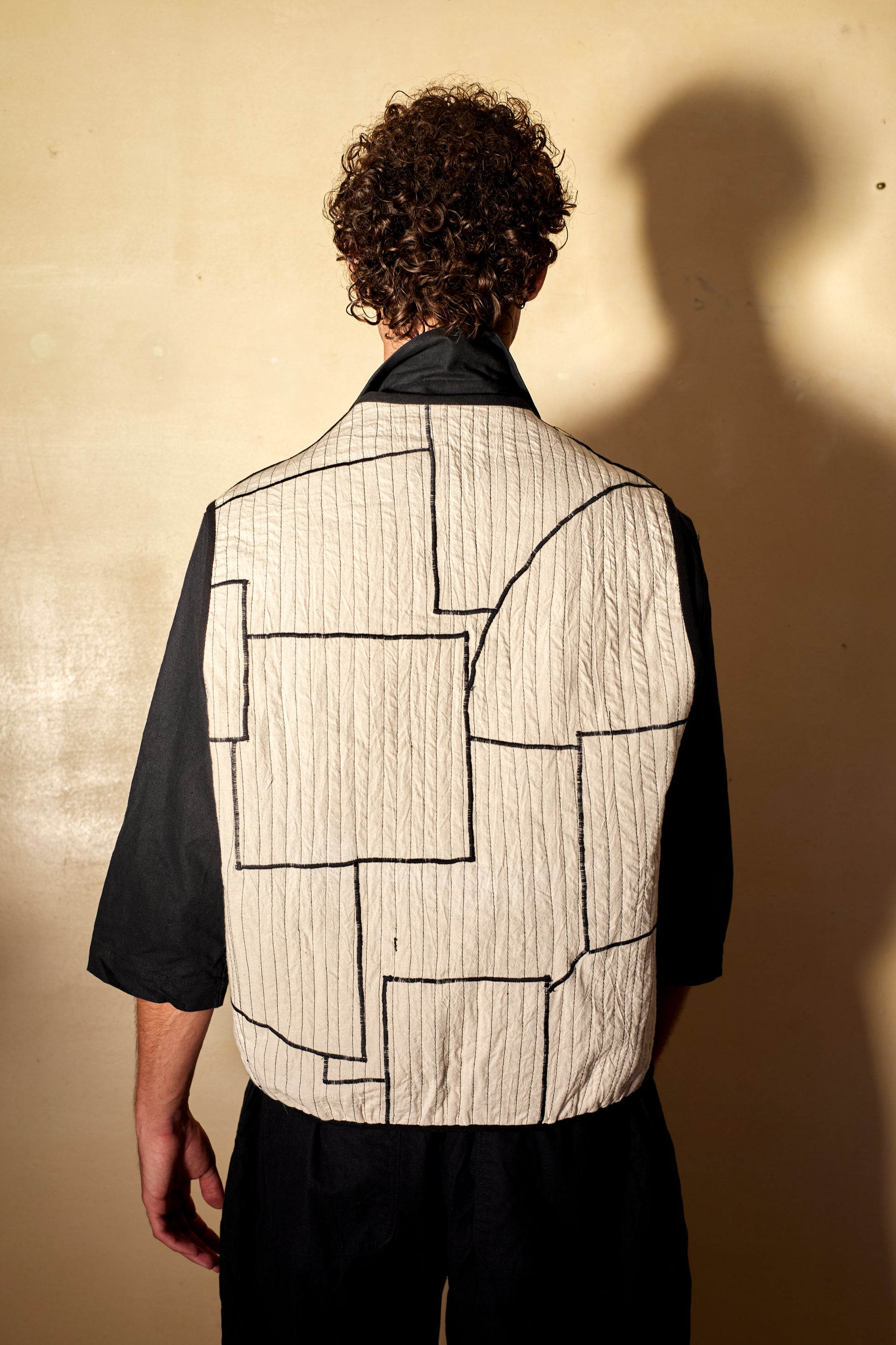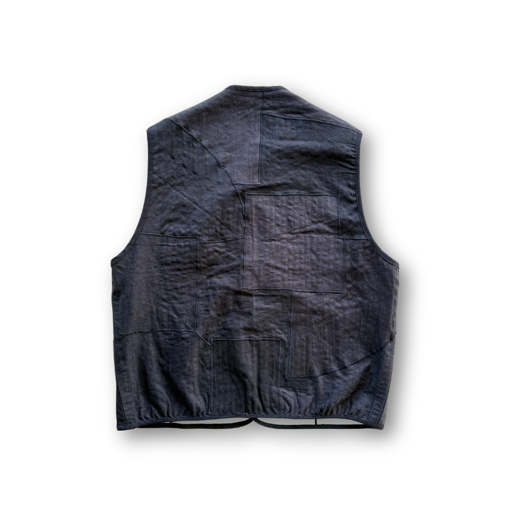 Crafted from patched hemp canvas discards, each vest is quilted into a richly layered textile, making visible the beauty of what might have been cast aside. The reversible design reveals intricate stitchwork on the reverse—an inside-out story of care and construction.